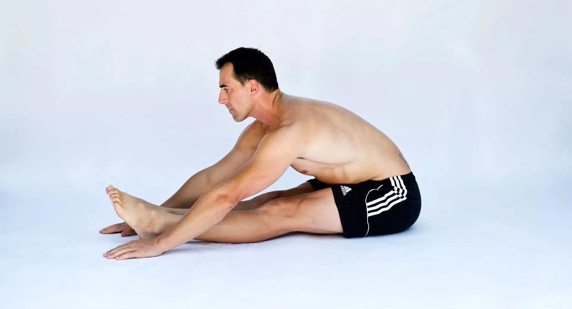 Сидя на полу, делайте небольшой наклон к ногам, сохраняя позвоночник прямым или слегка прогнутым в пояснице. Старайтесь максимально приблизить живот к бедрам — тогда спина будет оставаться ровной, что снизит нагрузку на диски.