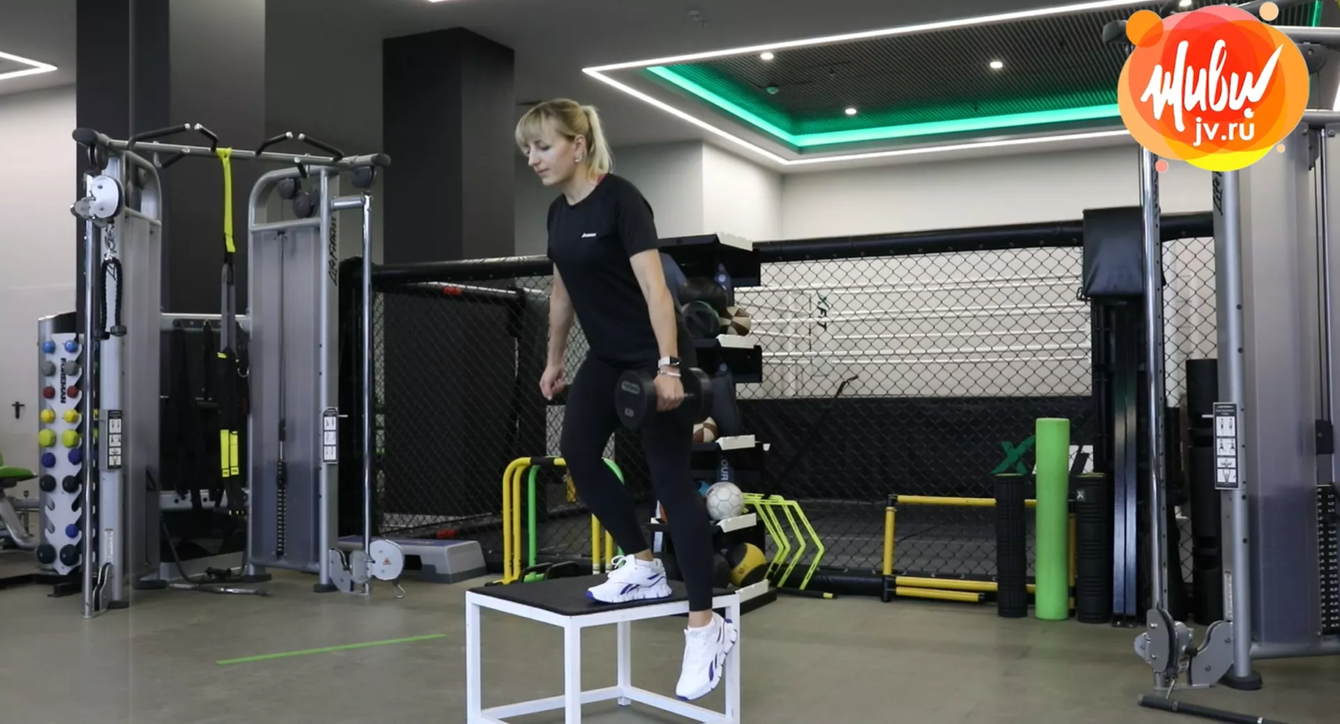 - Возьмите гантель в левую руку и поднимитесь на тумбу или другое подходящее возвышение.