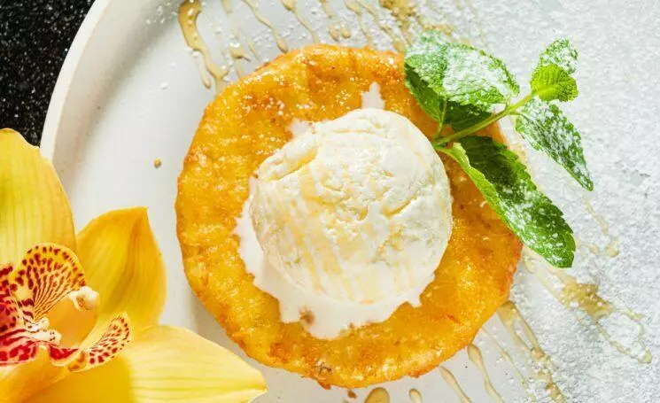 Ингредиенты: несколько больших круглых кусков свежего ананаса, 1 ст.л. сливочного масла, 1 ст.л. коричневого сахара, 2 ст.л. темного рома, 1 ч.л. ванильного экстракта, чашка ванильного мороженого, 2 ст.л. измельченной и обжаренной мякоти кокоса.
