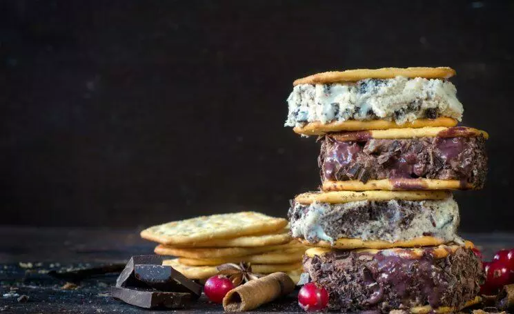 - На крекер или печенье положите кусочек мороженого, сверху поместите кружки банана, ягоды, посыпьте орехами. Накройте другим печеньем или крекером и полейте шоколадным соусом.