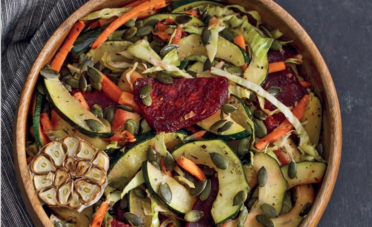 Инструкция. Головку чеснока, не очищая, разрежьте пополам. Свеклу очистите и нарежьте небольшими кусочками. Добавьте к ней масло, пряные травы, мускатный орех и соль. Перемешайте и выложите на застеленный пергаментом противень вместе с половинками чеснока. Запекайте в предварительно разогретой до 180°С духовке 10—15 минут. Капусту нашинкуйте и сложите в глубокую чашу. Морковь нарежьте соломкой (5 мм). Обжарьте на сухой сковороде на сильном огне до легкого почернения. Готовую морковь переложите в чашу с капустой. Кабачок нарежьте небольшими кусочками и обжарьте до золотистого цвета на умеренном огне. Используйте сковороду с хорошим антипригарным покрытием или же добавьте небольшое количество масла для жарки. Добавьте кабачок и свеклу в салат.