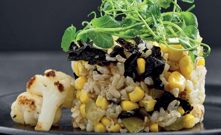 Ингредиенты. 400 г цветной капусты, 300 г кукурузы (вареной или консервированной), 1/2 ст. бурого риса, 100 г соленых огурцов или корнишонов, 2 листа нори, микрозелень или зеленый лук, 1/3 ч. л. соли.