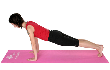 1. Поставьте ладони на пол на ширине плеч, направьте пальцы вперед. Отойдите ногами подальше назад и опуститесь в позу планки: все тело вытянуто в одну линию над полом, упор на ладони и пальцы стоп, пятки направлены назад, руки прямые. Подтяните пупок к позвоночнику, подтяните мышцы промежности и таз, направляйте подбородок к подъяремной впадине. Задержитесь в этом положении на пару дыхательных циклов.