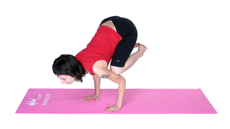 1. Сядьте на корточки с опорой на носки и поставьте ладони на коврик на ширине плеч. Раскройте пальцы рук и направьте их вперед, а локти — назад и немного в стороны. Постарайтесь передать максимум веса на ладони и основание большого пальца, это снимет лишнюю нагрузку с запястий. Согните руки в локтях, наклонитесь чуть вперед и поставьте колени на руки чуть выше локтей, чуть снаружи, как будто пытаетесь охватить коленями руки. Плотно сцепите руки с ногами. Не скругляйте спину, вытягивайте позвоночник, тяните плечи и лопатки назад, проворачивайте таз назад. Слегка подтяните промежность и подтяните пупок к позвоночнику.