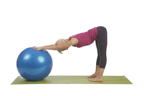Исходное положение. Встаньте, поставьте стопы на ширине бедер. Наклонитесь вперед и откатите от себя фитбол на расстояние вытянутых рук: голова, шея и весь позвоночник должны вытянуться в линию.