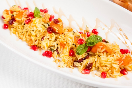 Ингредиенты. 140 г риса «Жасмин», 100 г сухофруктов (курага, изюм, вяленая клюква), 1 1/2 ст. л. растительного масла, специи (карри, зира) по вкусу, 10 г зерен граната, 10 г соуса «Наршараб», по 2-3 веточки кинзы и мяты.