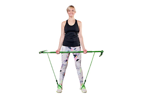 Проденьте стопы в петли амортизаторов и встаньте, поставив ноги на ширине плеч. Палку положите на плечи и удерживайте двумя руками. Стараясь зафиксировать нижнюю часть тела, плавно поверните корпус вправо, а затем сразу же, без остановки, влево. Продолжайте повороты в одну и другую стороны.