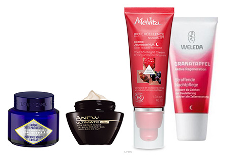 Ночной крем Immortelle, L’OCCITANE; ночной омолаживающий крем Anew Ultimate, AVON; ночной крем Bio-Excellence Naturalift, MELVITA; ночной крем –лифтинг с гранатом, WELEDA