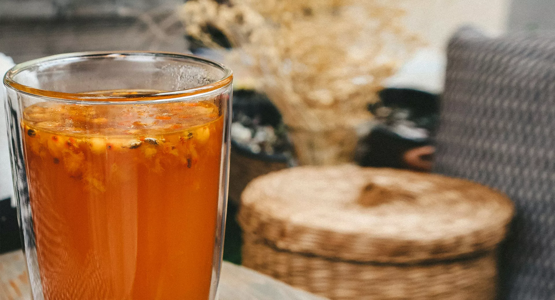 Ингредиенты (на 1 порцию): 5 г корня имбиря, 100 г замороженной облепихи, 1 ст. л. меда, 1 ст. л. сиропа маракуйи (или любого другого сиропа по вкусу), 1 веточка мяты, варенье по вкусу, 180 мл кипятка.
