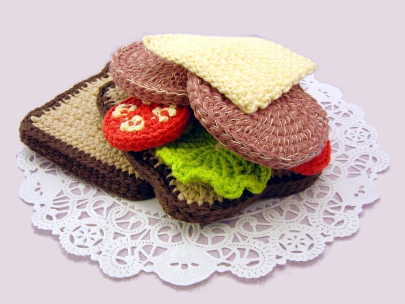 Интересные и остроумные работы создает NeedleNoodles — здесь уже появляются целые блюда вязаной еды, от суши до банальных бутербродов, где связано все, от первого до последнего ингредиента.