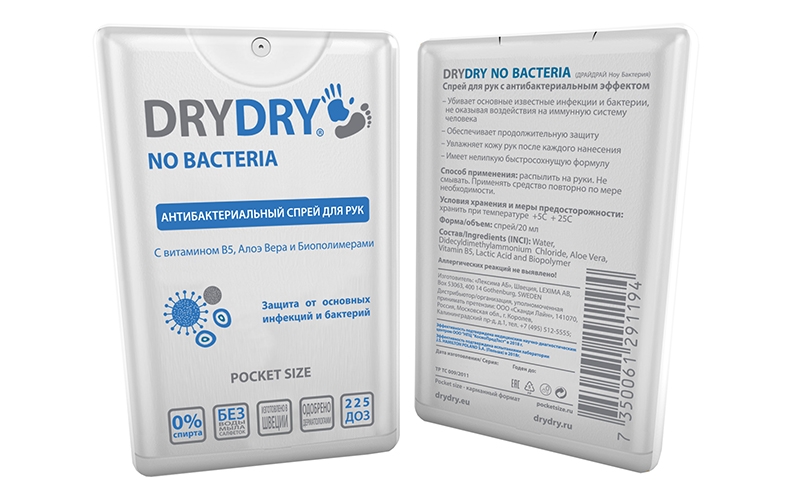 А вот это средство – фаворит любой косметички! Антибактериальный спрей для рук Dry Dry NO BACTERIA идеально подходит для людей, ведущих активный образ жизни: плоский флакон объемом 20 мл просто держать под рукой даже в самых экстремальных обстоятельствах. Достаточно пару раз распылить Dry Dry NO BACTERIA на ладони, чтобы избавиться от ощущения грязных рук и уничтожить бактерии. Чистоту рук помогает сохранить экстракт Алоэ Вера, который убивает микробы, грибки и вирусы, витамин В5 укрепляет эпидермис, а биополимеры создают на поверхности ладоней неощутимую защитную пленку. Жидкость быстро впитывается и не оставляет липкого слоя. Антибактериальное средство подходит для всех типов кожи и не вызывает аллергию. Кстати, Dry Dry NO BACTERIA можно дезинфицировать также экраны мониторов и смартфонов, на которых концентрируется еще большее число бактерий, чем на ладонях, так что оно пригодится не только в спортивном зале, но и в повседневной жизни.