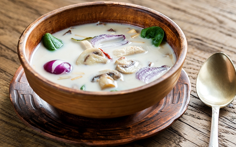 Инструкция. Подогрейте ½ ст.л. арахисового масла и обжарьте грибы до готовности. Добавьте лимонный сок. Цуккини потушите в оставшемся арахисовом масле 2—3 мин. Порубите нижнюю часть лимонника. Кокосовое молоко влейте в кастрюлю, добавьте лимонник, доведите до кипения. Варите на небольшом огне 10 мин. Цуккини разомните, выложите в кастрюлю и варите на медленном огне. Добавьте грибы, тофу и сок лайма. Приправьте соевым соусом, измельченным перцем чили, солью и перцем. Листья кориандра мелко порубите. Кориандр и зеленый лук разложите по тарелкам и разлейте суп.