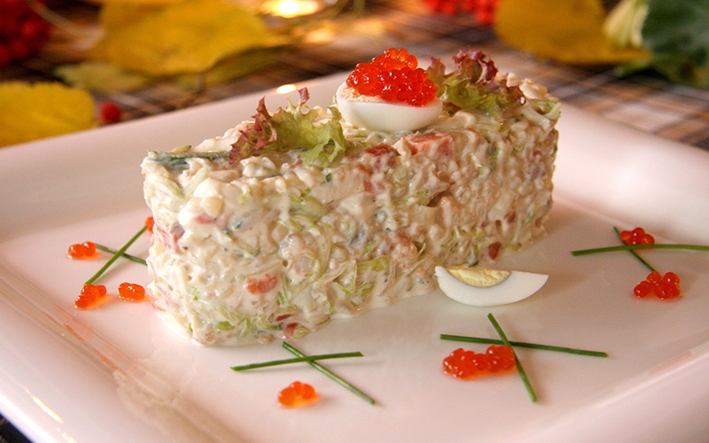 Оливье с цесаркой, телячьим языком и раковыми шейками