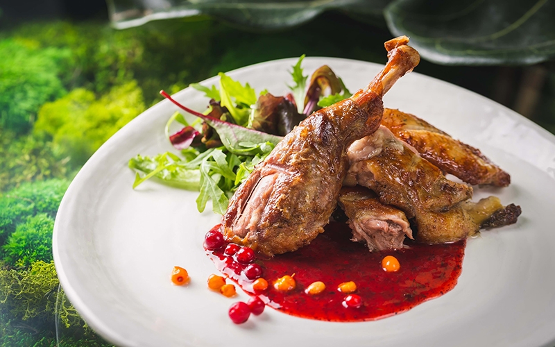 Ингредиенты: 270 г цесарки, 50 г соуса аджика, 10 г микса салатного, 10 г соуса черная смородина. Для маринада: 2 г соли, 0,1 г перца, 1 г тимьяна, 1 г розмарина, 12 г майонеза домашнего, 2 г чеснока.