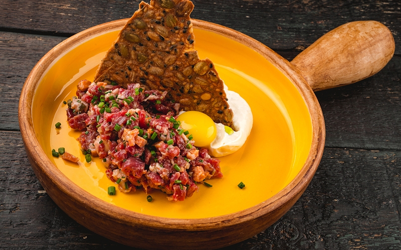 Ингредиенты: 100 г мраморной говядины (сырой), 30 г говяжьих колбасок копченых, несколько штук каперсов, 1 желток перепелиного яйца, соль и перец по вкусу, 2 г лука шалот, соусы ворчестер и табаско по вкусу, горчица по вкусу. Для соуса: 20 г сыра «Скаморция», 20 г молока, небольшое количество трюфельного масла.