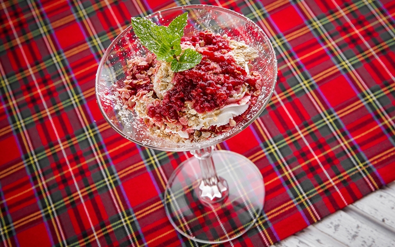 Ингредиенты: 30 г взбитых сливок, 50 г малины, 15 г виски, 10 г овсяных хлопьев, 10 г сахара, 10 г меда, 2 г мяты.