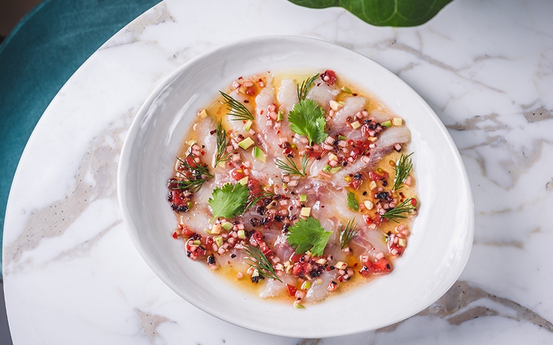 Инструкция. Сибас нарежьте слайсом. Приготовьте соус. Яблоки, помидор, авокадо порежьте мелким кубиком. Смешайте с перцем, чили, лимонным и лаймовым фрешом, оливковым маслом, посолите. Тщательно перемешайте. На сервировочную тарелку налейте половину соуса, выложите слайсы сибаса, сверху полейте второй половиной соуса, посолите, поперчите, украсьте укропом и посыпьте вялеными ягодами.