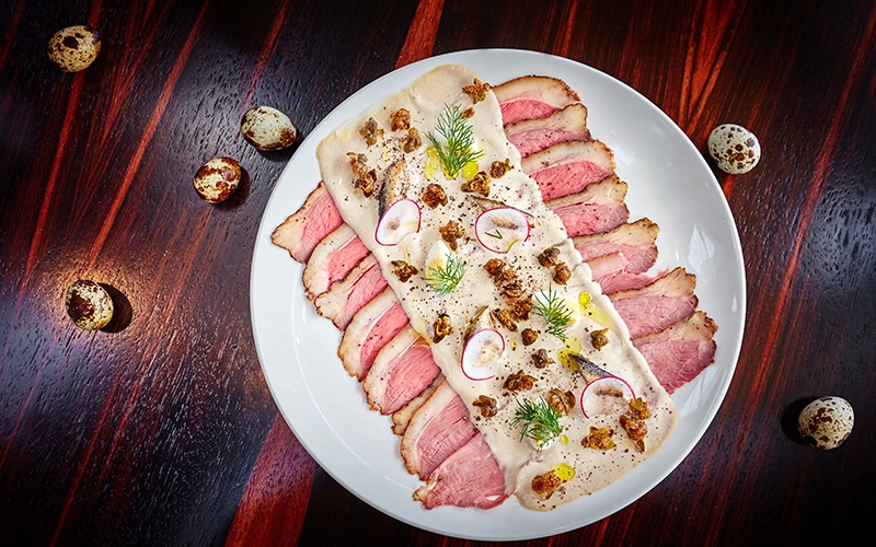 Ростиф из мраморной говядины с соусом из рижских шпротов и тунца