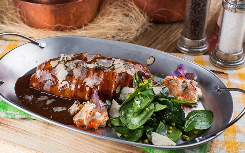 Для подачи: 50 г соуса куриного Демиглас, 2 г трюфельного масла, 2 г черного трюфеля свежего, 10 г бэби шпината, 3 г рубленных фисташек, 1 г салата кресс.