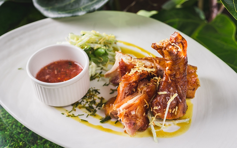 Ингредиенты: 300 г поросенка, 50 г соуса аджика, 60 г редьки с хреном.