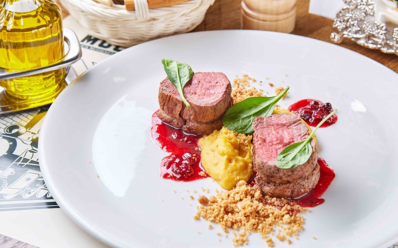 Ингредиенты: 160 г телячьей вырезки, 20 г масла растительного, 30 г масла оливкового, 10 г чеснока, 2 г розмарина, 8 г соуса брусничного, 1 г мини шпината, 1г перца, 1 г соли.