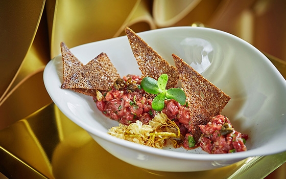 Ингредиенты: 100 г говяжьей вырезки, 2 г соли, 1 г перца, 15 г лука шалот, 8 г горчицы дижонской, 3 г табаско, 5 г петрушки, 15 г масла оливкового, 15 г гренок из бородинского хлеба, 4 г салата корн.