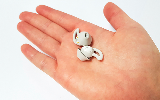 Bose Sleepbuds чем-то похожи на привычные беспроводные наушники: небольшие, сделанные из белого пластика. Что приятно, в комплекте несколько вариантов мягких насадок из силикона в трех размерах SML. Легко можно выбрать те, что подходят под размер вашей ушной раковины.