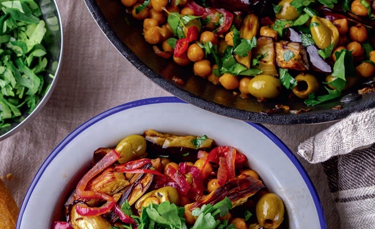 Ингредиенты. 2 баклажана, 400 г консервированного или вареного нута, 100 г оливок, 1 красная луковица, 1 маленький перец чили, 2 зубчика чеснока, 1 маленький пучок кинзы или петрушки, сок 1 лимона, 1 ст. л. меда, по 1 ч. л. тмина и паприки, оливковое масло, соль, молотый черный перец.
