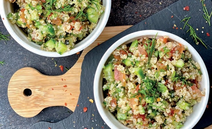 Ингредиенты. 40 г киноа, 50 г помидоров без мякоти и семян, 50 г огурцов, 2–3 веточки мяты, 2–3 веточки петрушки, 1–2 веточки укропа, 15 мл оливкового масла, 2–3 ст. л. сока лимона, соль и перец по вкусу.