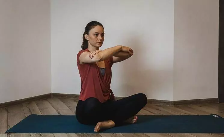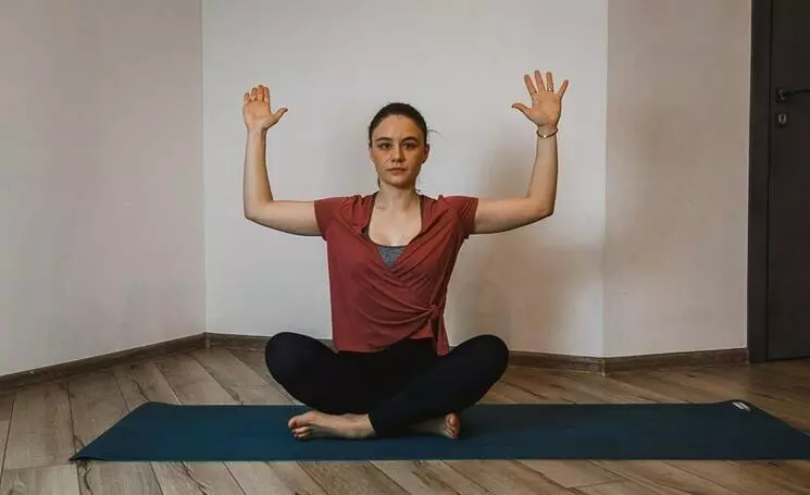 - Сядьте на пол в удобную позу со скрещенными ногами. Разведите руки в стороны, согнув локти. Ладони направьте вперед.