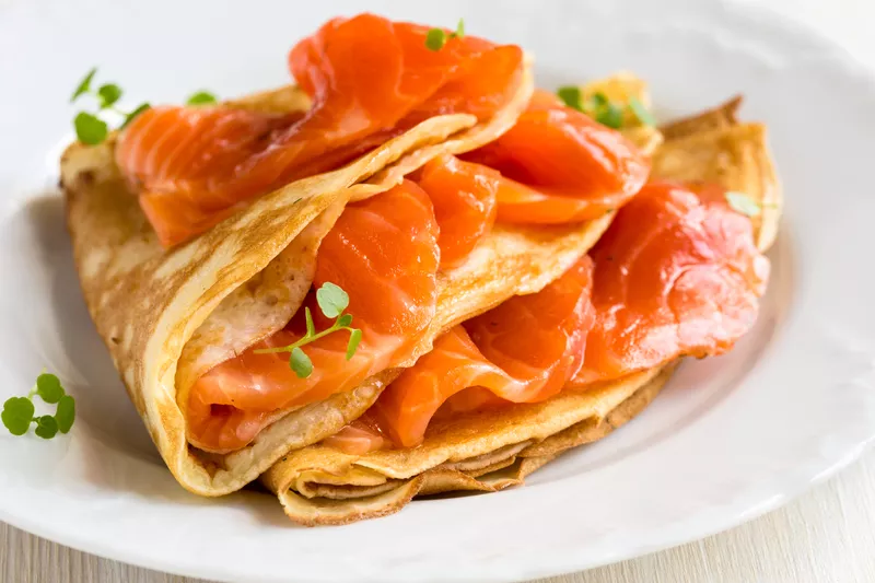 - Готовые блинчики подавайте с сыром креметта и тонкими ломтиками лосося.