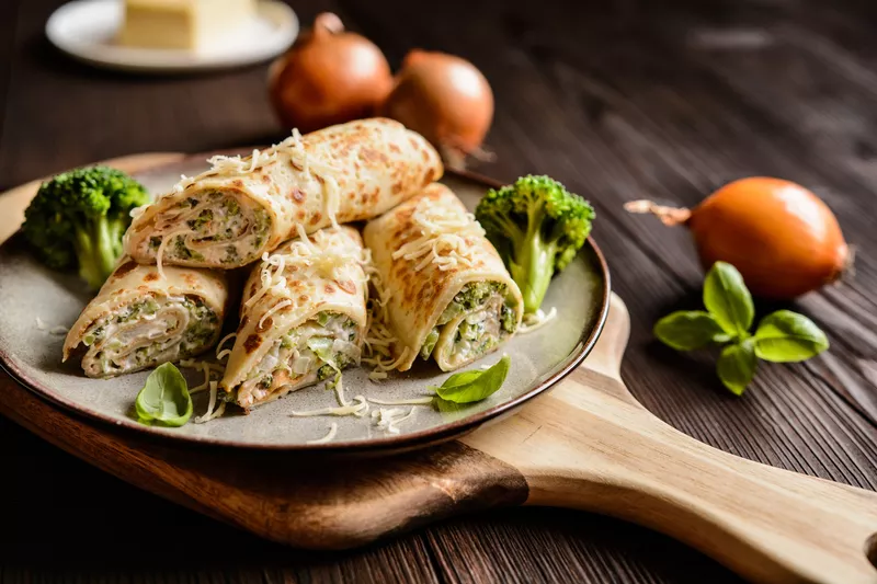 Принимайте во внимание и консистенцию начинки. Если блины тонкие и ажурные, жидкая или тающая при тепловой обработке начинка в них не удержится. Здесь нужно что-то более плотное.