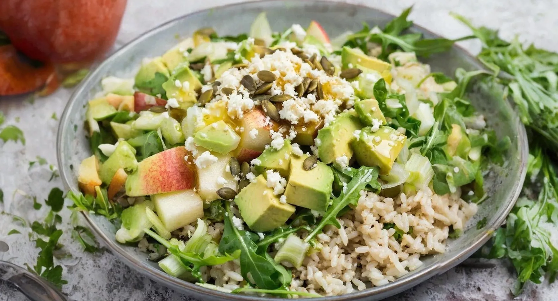 Сельдерей нарежьте тонкими ломтиками. Сыр фета покрошите. В небольшой банке или чашке смешайте оставшийся лимонный сок, масло, горчицу, соль и перец. Взболтайте до состояния эмульсии. В большой салатнице соедините рис, рукколу, авокадо, яблоко и сельдерей. Полейте заправкой и аккуратно перемешайте. Разложите салат по тарелкам, посыпьте сверху тертым сыром фета и тыквенными семечками.