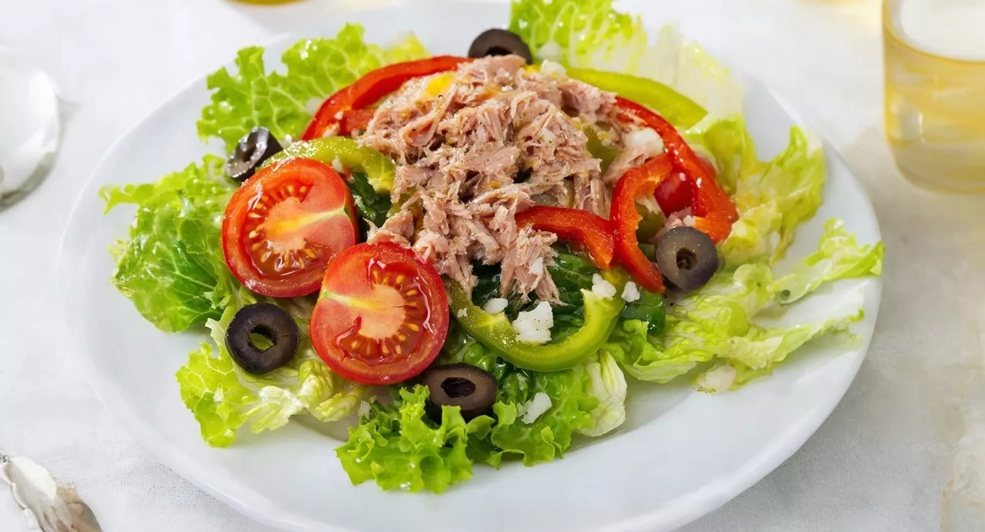 Инструкция. Нарежьте маслины тонкими кольцами. Измельчите перец и помидоры. На блюдо выложите листья салата и добавьте консервированный тунец. Приправьте салат специями и пропущенным через пресс чесноком. Полейте сверху оливковым маслом и сбрызните лимонным соком.