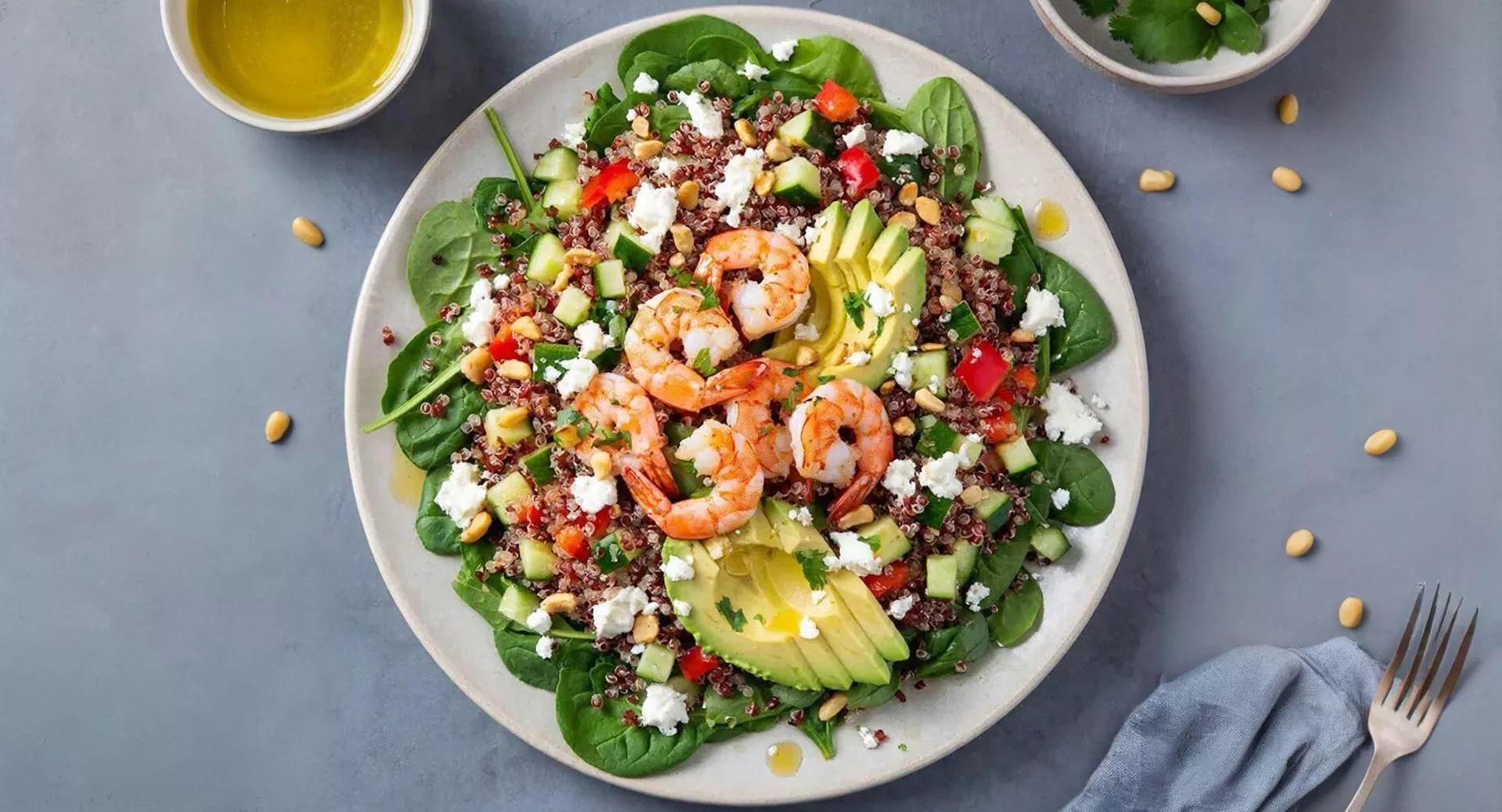 Инструкция. Киноа промойте и отварите в подсоленной воде 15 минут, остудите. Креветки обжарьте на сухой сковороде по 2 минуты с каждой стороны, приправьте солью и перцем. Огурец и болгарский перец нарежьте небольшими кубиками, авокадо — тонкими ломтиками. Кедровые орехи подсушите на сковороде до золотистого цвета. На большое плоское блюдо выложите шпинат, сверху распределите киноа, овощи и креветки. Разложите ломтики авокадо веером, раскрошите фету, посыпьте кедровыми орехами. Для заправки смешайте оливковое масло, сок лайма, мед и рубленую кинзу. Перед подачей полейте салат заправкой.