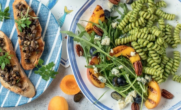 Ингредиенты. Пучок рукколы, 170 г персиков, 70 г голубики, 70 г любых орехов, 70 г сулугуни, 2 ст.л. бальзамического соуса,2 ст. л. оливкового масла, соль и молотый черный перец по желанию.