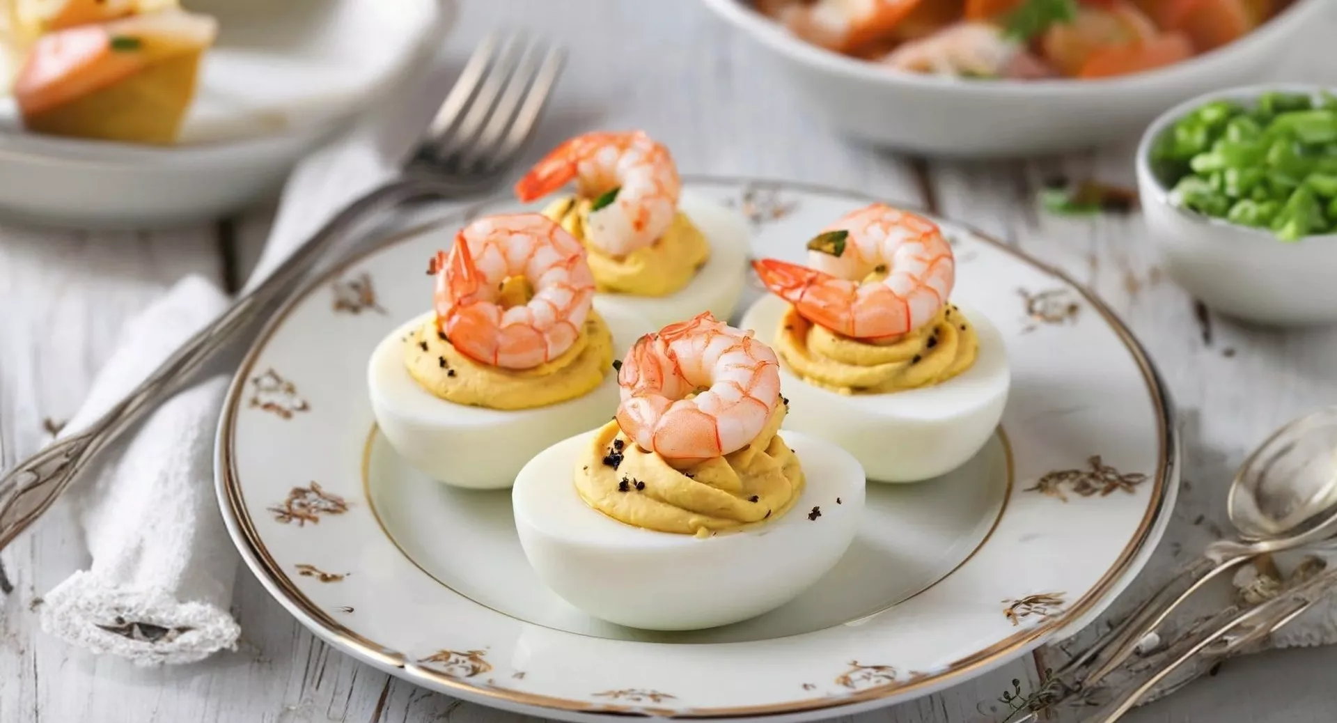 Инструкция. Яйца сварите вкрутую, остудите, очистите. Аккуратно разрежьте пополам, выньте желтки. Отваренные или консервированные креветки мелко нарежьте. Желтки соедините с майонезом и растолките вилкой, добавьте горчицу и нарезанные креветки. Огурец нарежьте соломкой. Наполните смесью половинки белков, воткните кусочек огурца.