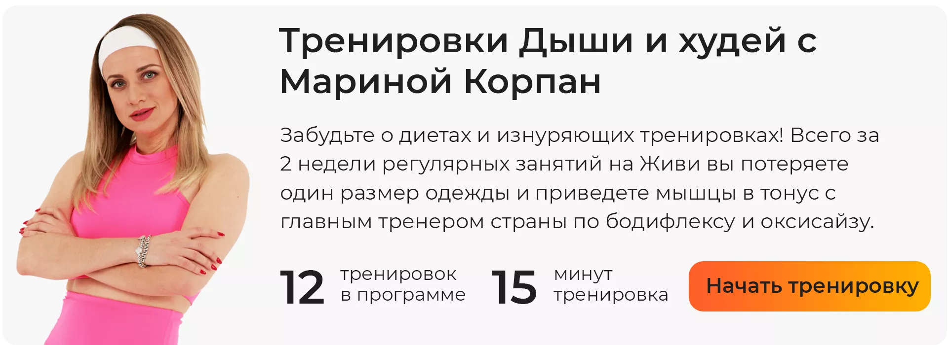 Для успешного похудения необходимы здоровое питание и умеренные физические нагрузки. Оформите подписку на «Живи!» и получите полный доступ к нашим тренировкам по 60+ направлениям фитнеса и начните тренироваться дома прямо сейчас!