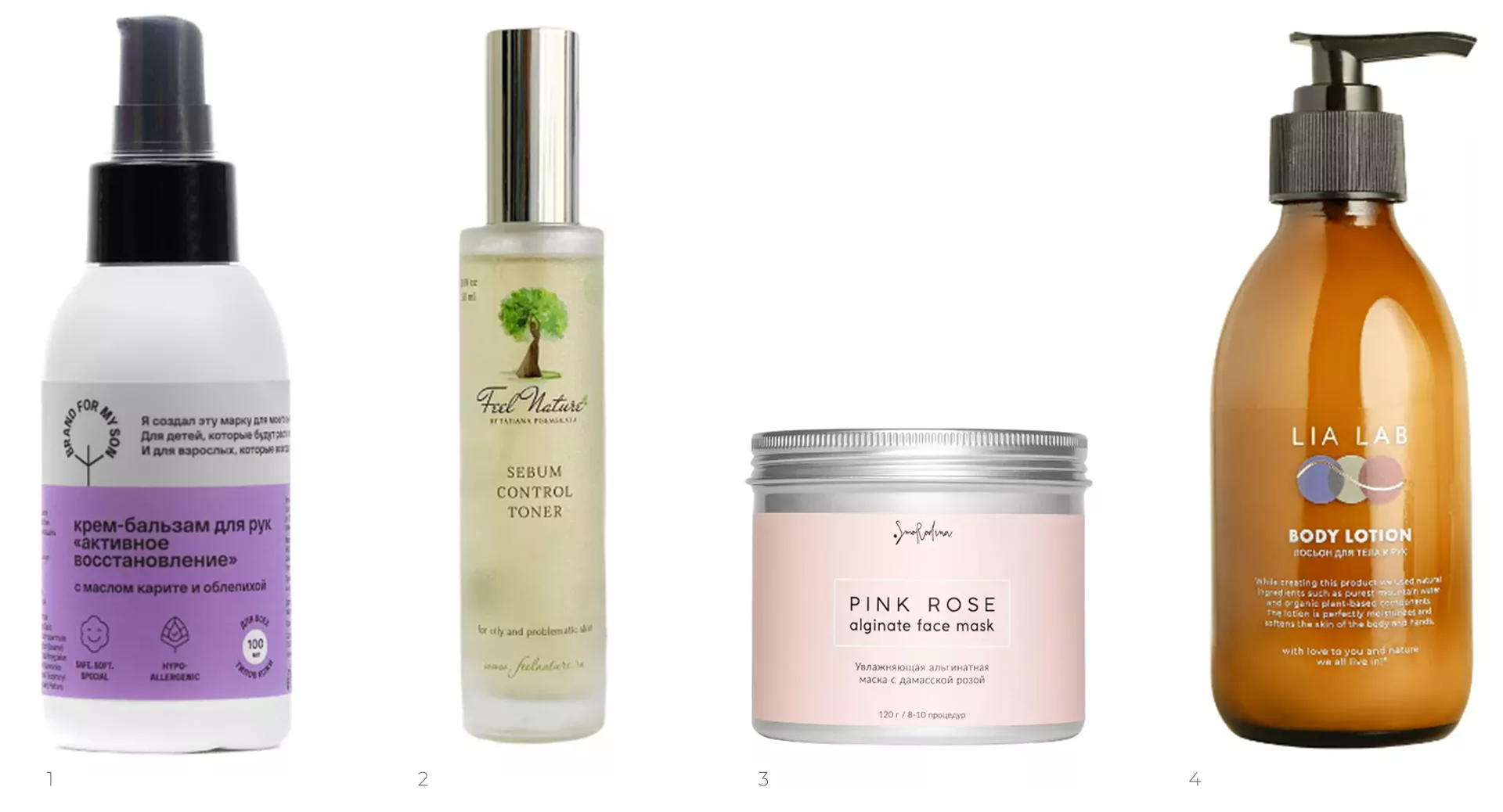 На фото: 1 - крем-бальзам для рук "Активное восстановление", Brand for my son; 2 - тоник для лица, Feel Nature; 3 - увлажняющая альгинатная маска для лица, Smorodina; 4 - лосьон для тела, LIA LAB.