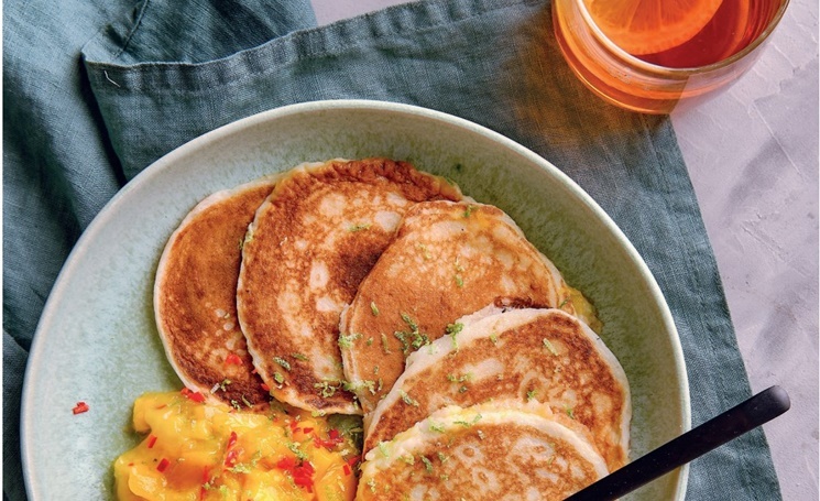 Для соуса нарежьте манго мелкими кубиками, добавьте цедру целого лайма и сок ¼ лайма. Мелко нарежьте и добавьте по вкусу перец чили, предварительно удалив семечки и плодоножку. Выложите оладьи на тарелку, полейте соусом или подайте его отдельно.