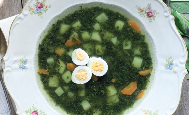 Ингредиенты. 4 средних пучка шпината, 4 картофелины, 1 морковка, 1 луковица, 1 голень индейки,корешок петрушки, перепелиные яйца, соль.
