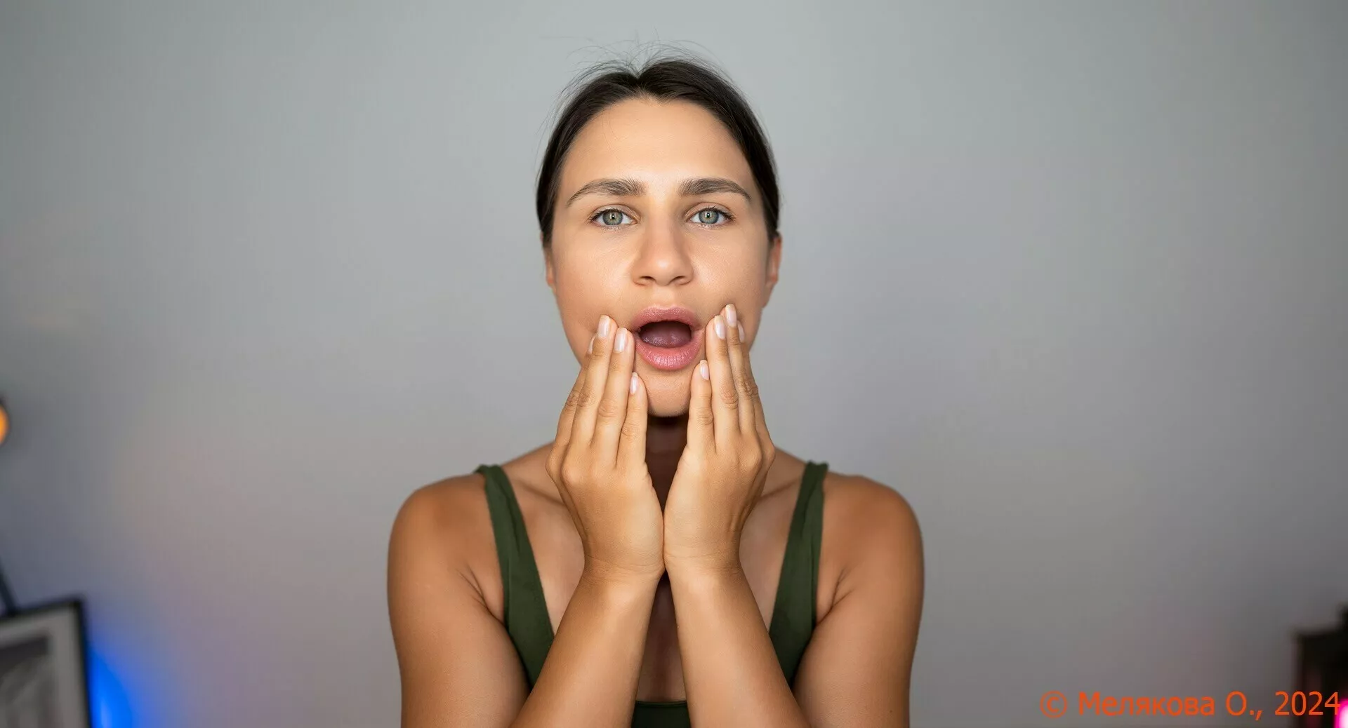 5. Расположите пальцы в области подбородка и проглаживающими движениями смещайте пальцы от подбородка к уголкам рта, при этом вытягивая круговую мышцу рта и пытаясь затянуть губы вовнутрь.