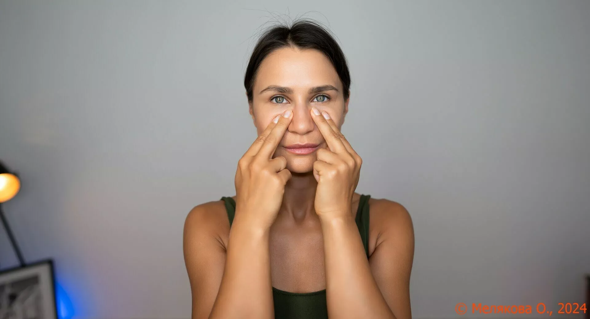 6. Подушечками указательного и среднего пальцев малоамплитудными круговыми движениями проглаживайте ткани крыльев носа от центра в стороны.