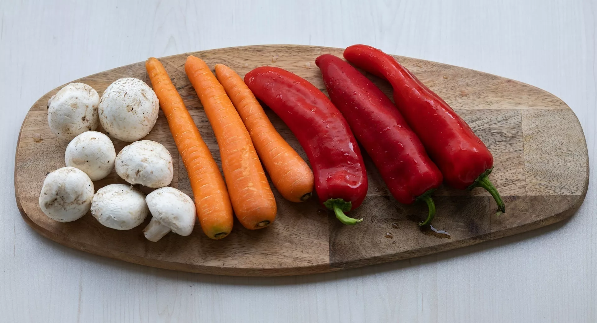 Инструкция. Овощи и шампиньоны вымойте. У болгарского перца удалите сердцевину, лук очистите. Болгарский перец разрежьте на несколько крупных частей.