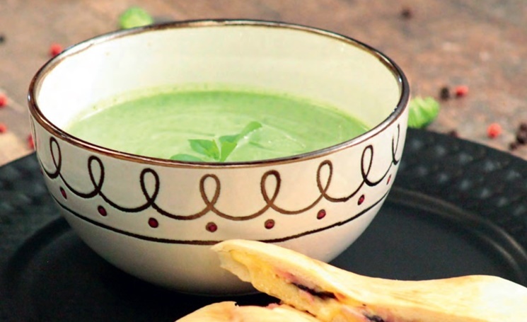 Когда питы будут готовы, можно продолжить приготовление супа. Влейте сливки, доведите суп до кипения и добавьте листья шпината. Если вы варите суп не для длительного хранения, то до кипения доводить не обязательно. Посолите, поперчите и положите в суп нарезанный зеленый лук. Через 1 минуту снимите с огня и пробейте овощи блендером. Перед подачей суп в тарелке полейте чесночным маслом и украсьте листиками орегано.