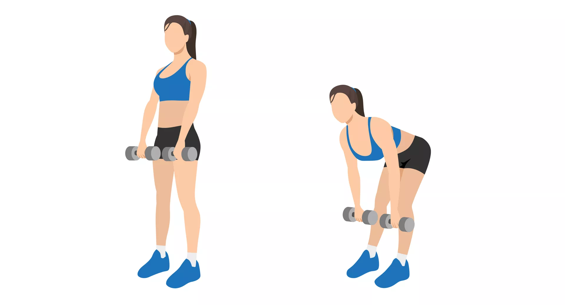 - На вдохе плавно уведите таз назад, сохраняя естественный прогиб в пояснице. Гантели в это время плавно движутся вдоль бедер и голеней. В мышцах задней поверхности бедра и ягодицах сохраняется напряжение.