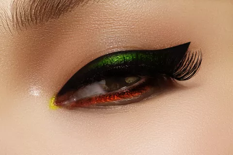 Яркие и насыщенные цвета (красный, желтый, зеленый, голубой, бордовый, синий, бирюзовый) — отличительный признак вечернего макияжа. В Новый год не возбраняется украсить мейк стразами, блестками, пигментами.