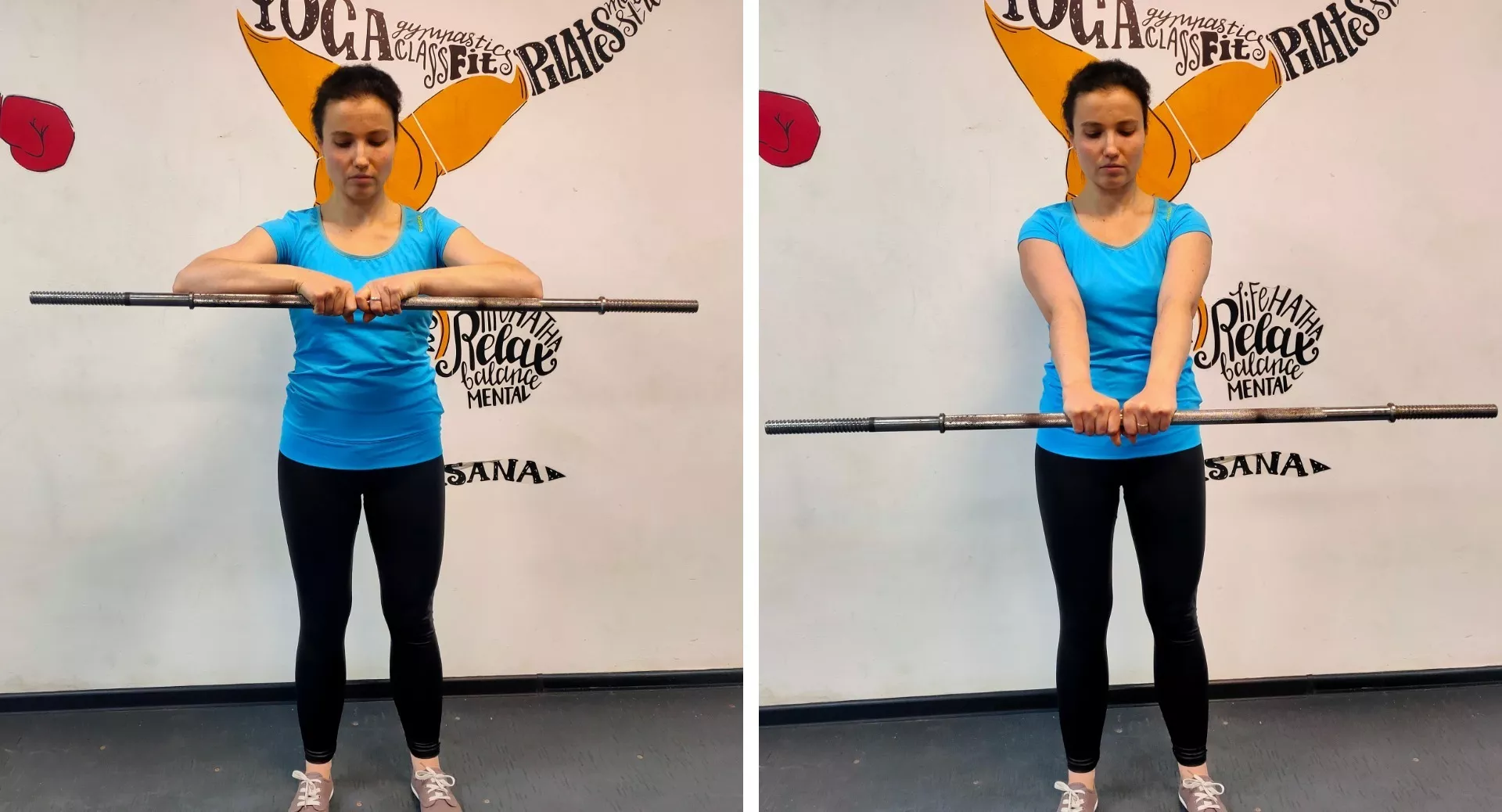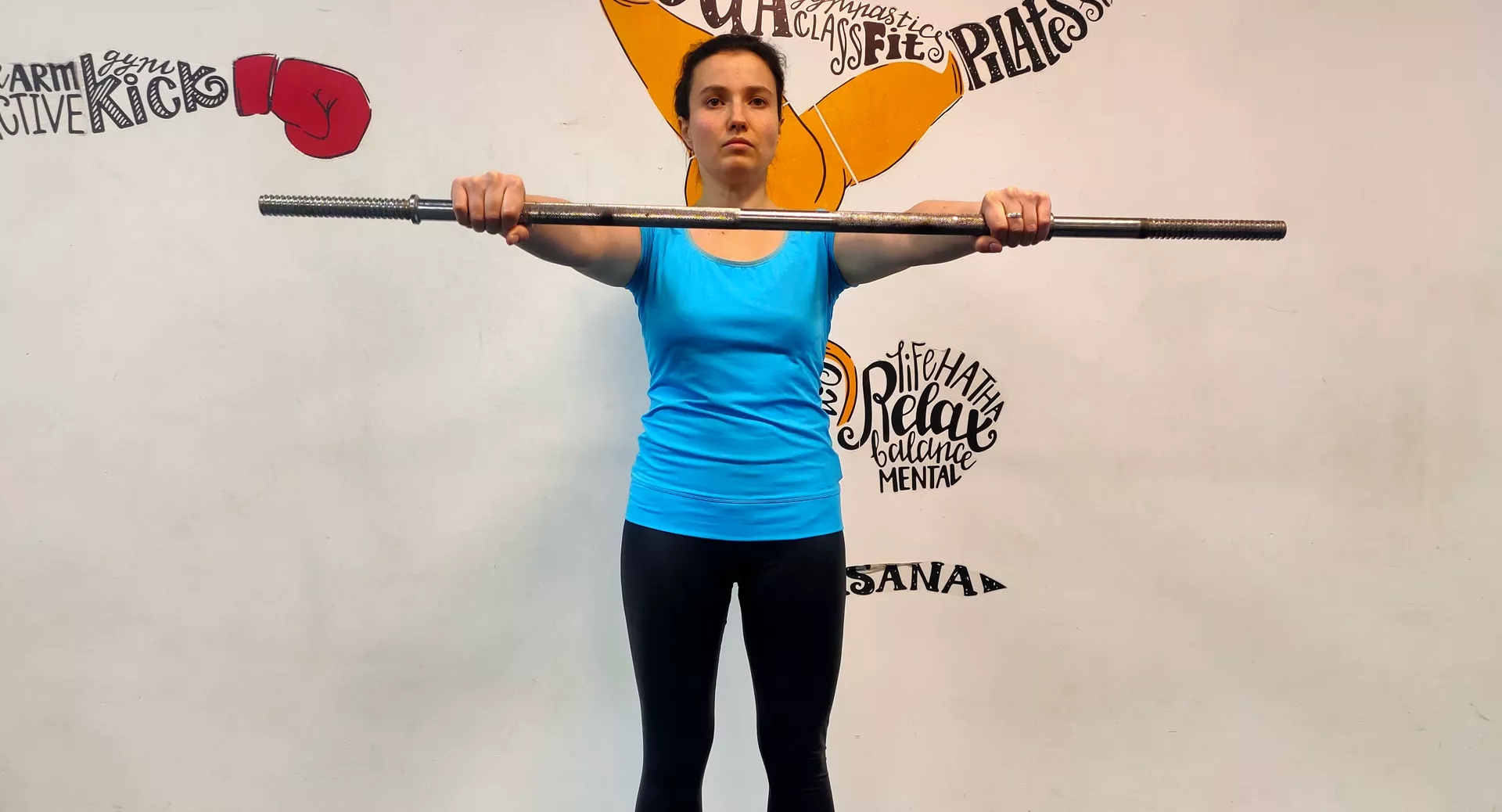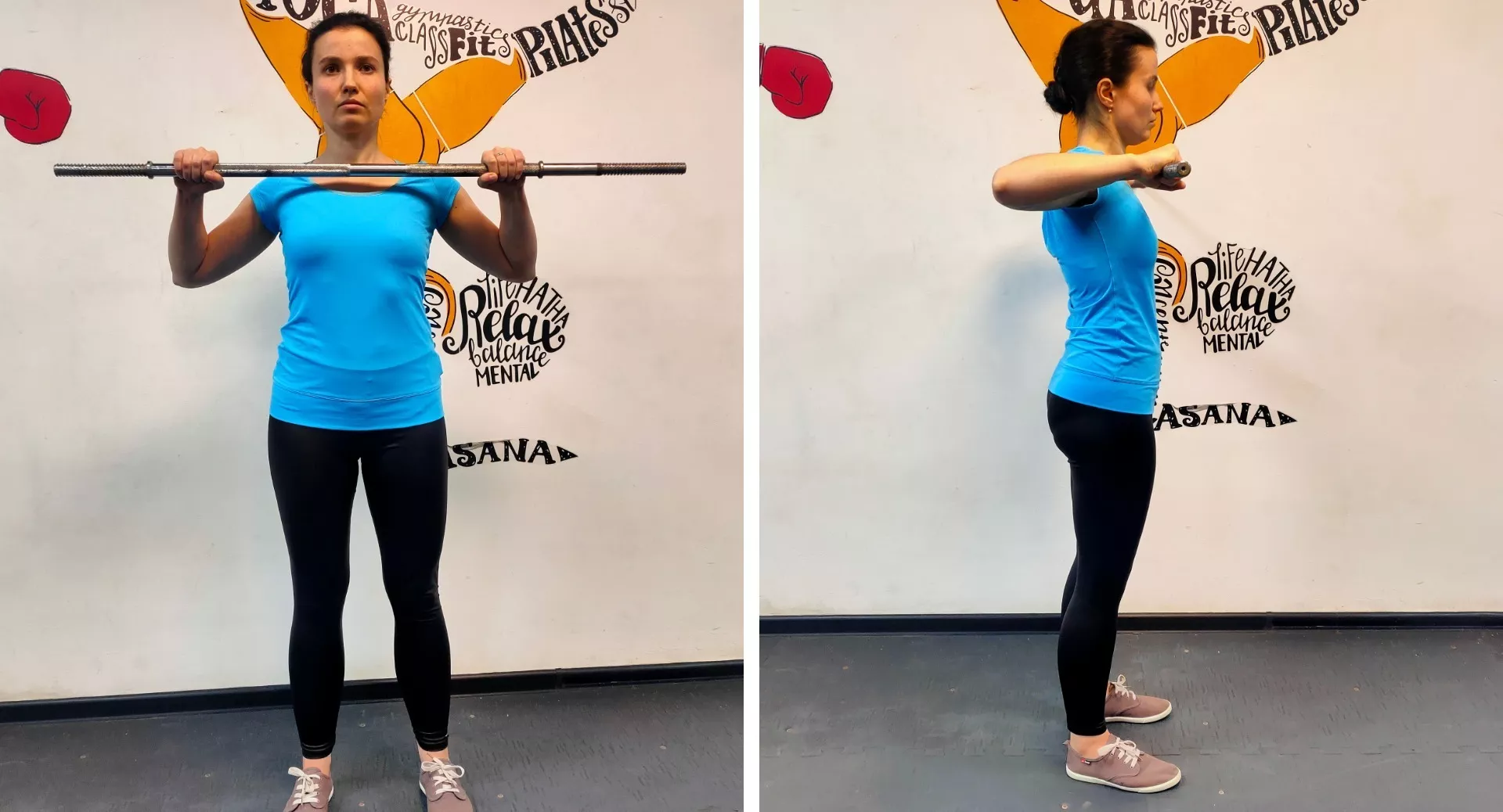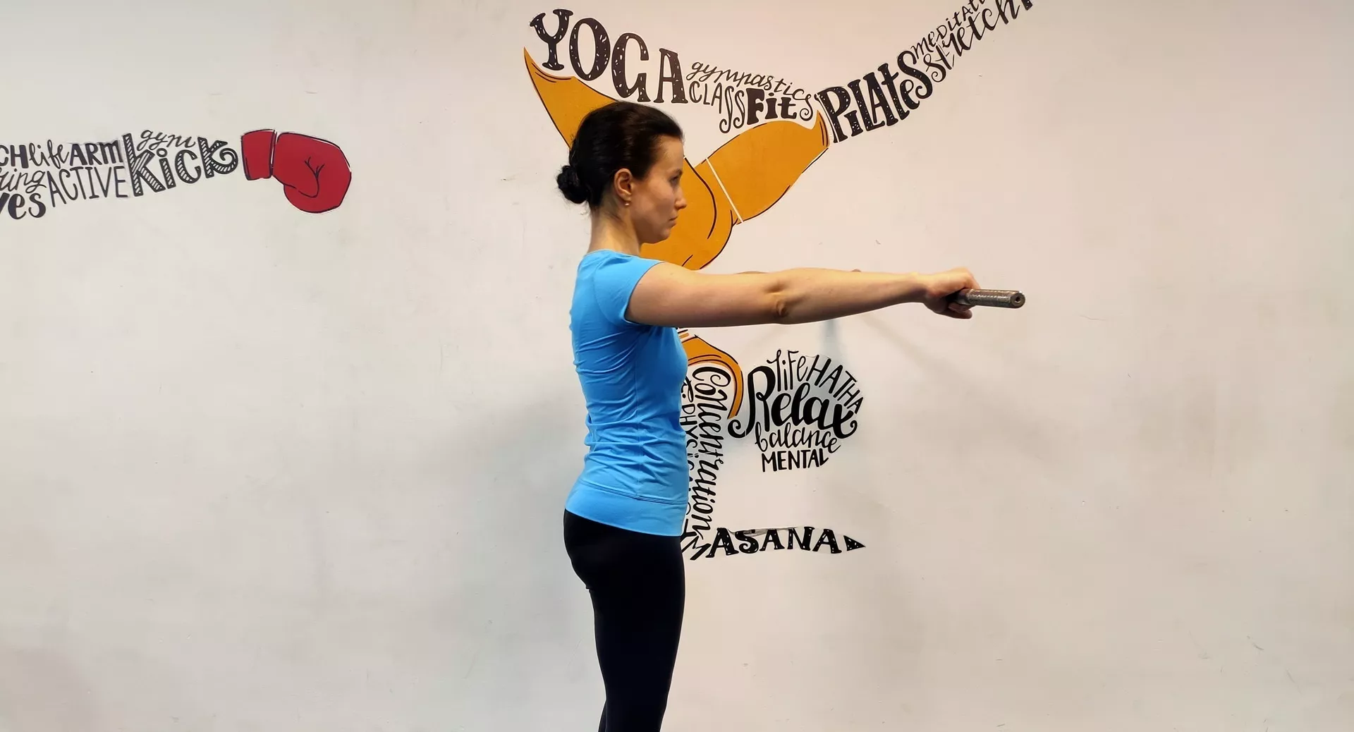 - на вдохе медленно согните локти, удерживая руки параллельно полу, а палку на уровне ключиц;