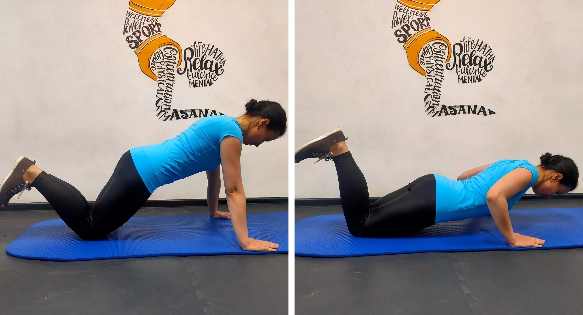- отжимания на коленях: колени упираются в пол, при опускании вниз передняя поверхность бедра соприкасается с полом;