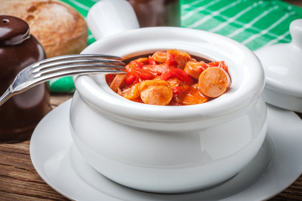 Инструкция. Разогрейте духовку до 250 градусов. Застелите противень пергаментной бумагой. Положите тыкву, брокколи, болгарский перец и лук в миску и сбрызните оливковым маслом. Разложите в один слой на противне для выпечки. Приправьте солью и перцем и запеките в течение 15-20 минут. Сосиски нарежьте ломтиками и добавьте к овощам. С помощью лопаточки перемешайте овощи и сосиски. Готовьте блюду еще около 10 минут. При подаче можно посыпать блюдо хлопьями красного перца.
